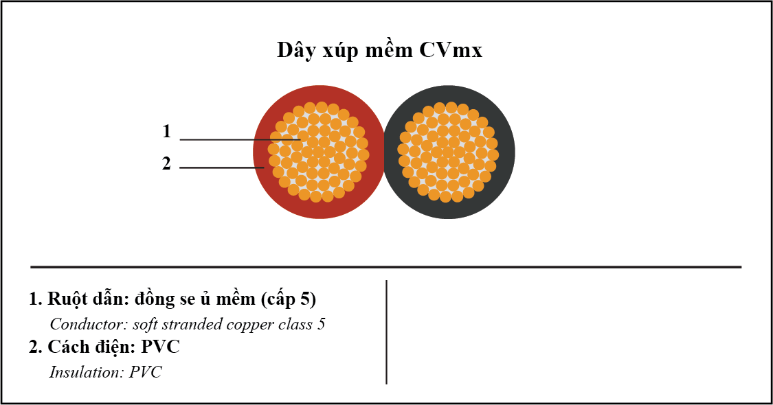 | Tiết diện mặt cắt danh định | Ruột dẫn điện/ Conductor | Chiều dầy cách điện danh nghĩa | Đường kính tổng gần đúng | Điện trở ruột dẫn lớn nhất ở 20oC | |